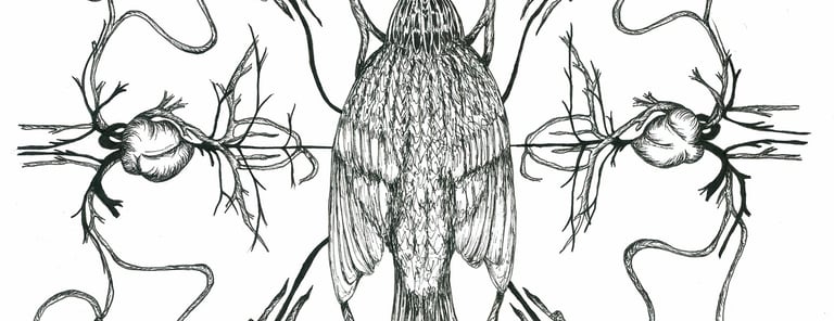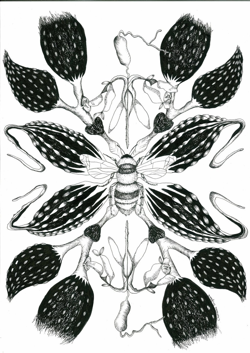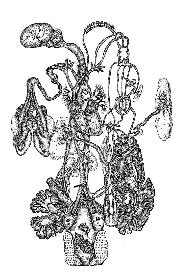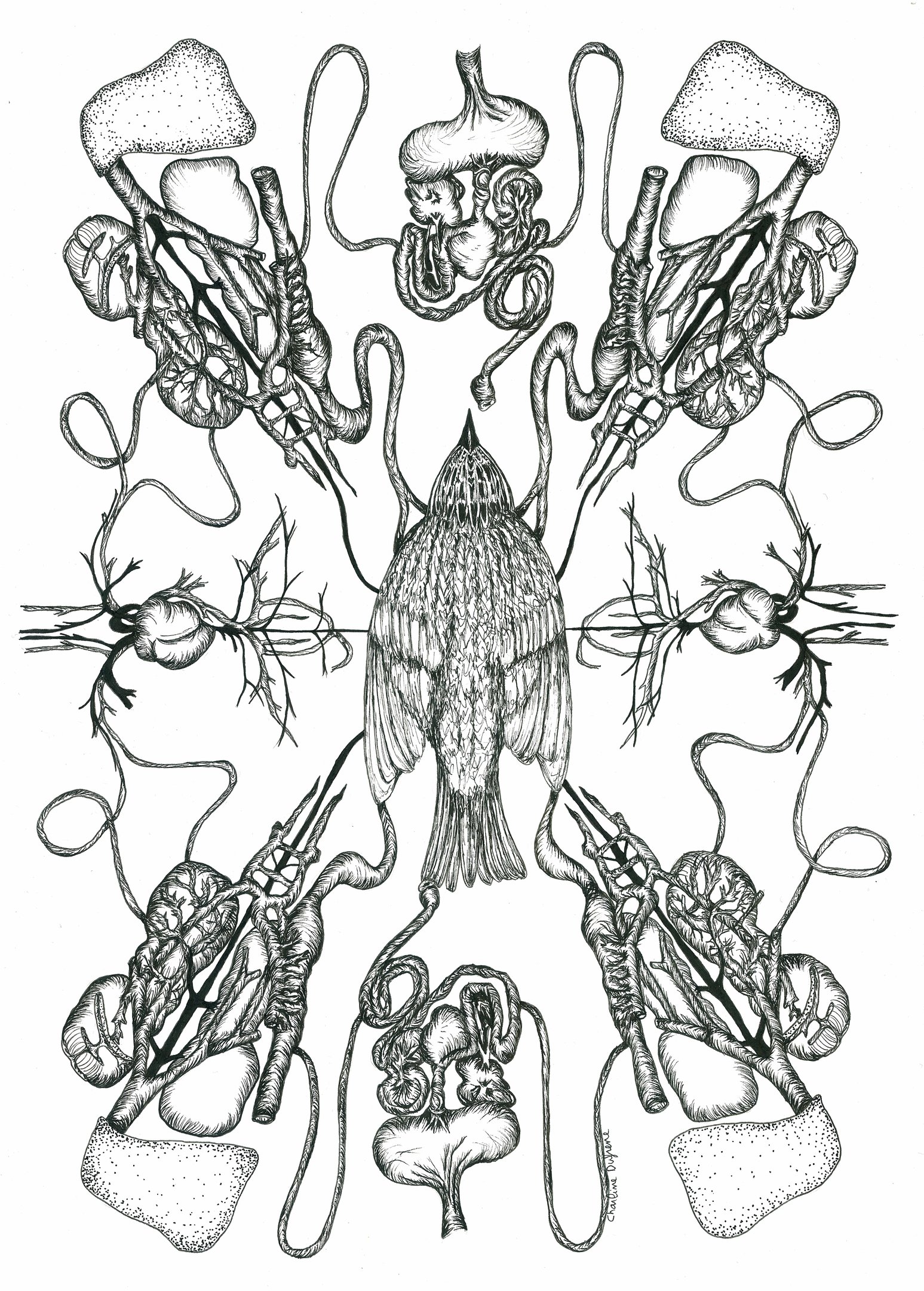 Durant mes études aux Beaux arts mes recherches et ma pratique artistique se sont portées sur la science et notamment les dessins scientifiques. Je me suis passionnée pour les dessins d'organes; leurs formes si surprenantes, parfois végétales... Je trouve ça incroyable et cette passion ne m'a jamais quittée ! Encore aujourd'hui je collectionne de la littérature et des dessins scientifiques, cette matière m'inspire des dessins que je nomme "Chimères". Ils sont le résultat d'un entremêlement d'organes. Je joue avec les formes, avec la symétrie. Je crée un petit monde en noir et blanc, un monde organique entre science et chimère