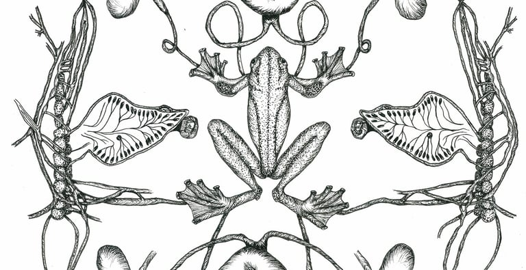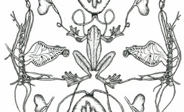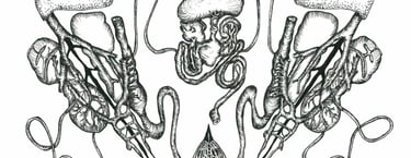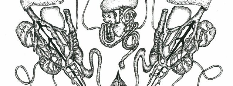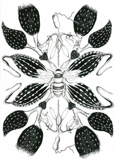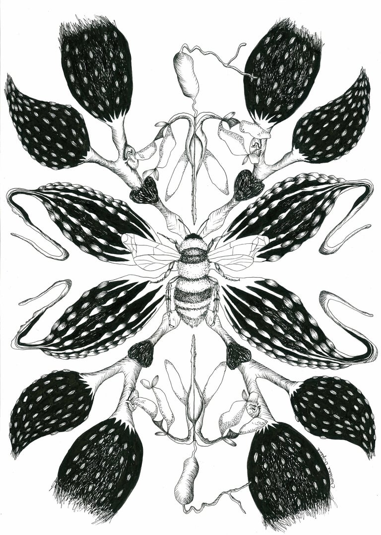 Durant mes études aux Beaux arts mes recherches et ma pratique artistique se sont portées sur la science et notamment les dessins scientifiques. Je me suis passionnée pour les dessins d'organes; leurs formes si surprenantes, parfois végétales... Je trouve ça incroyable et cette passion ne m'a jamais quittée ! Encore aujourd'hui je collectionne de la littérature et des dessins scientifiques, cette matière m'inspire des dessins que je nomme "Chimères". Ils sont le résultat d'un entremêlement d'organes. Je joue avec les formes, avec la symétrie. Je crée un petit monde en noir et blanc, un monde organique entre science et chimère.