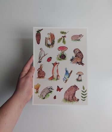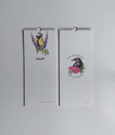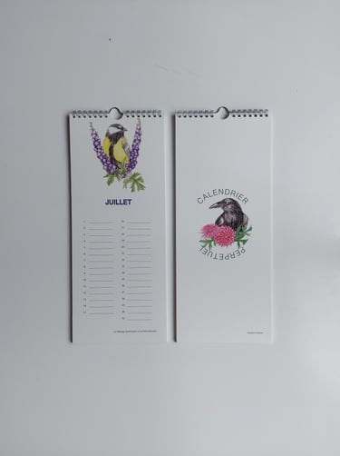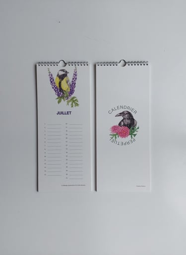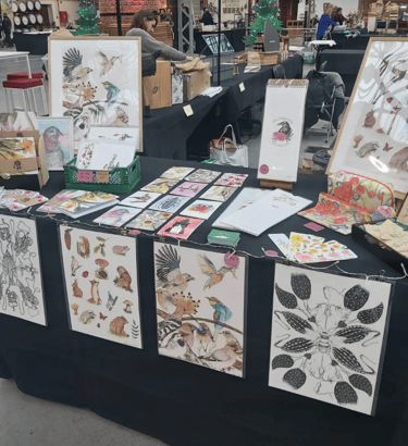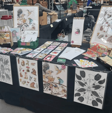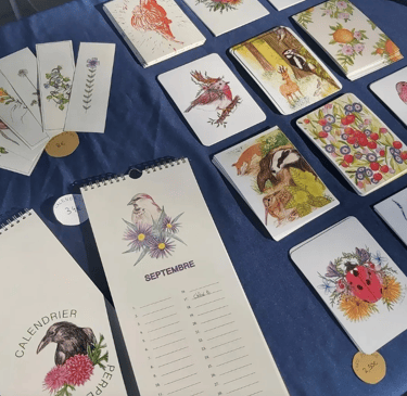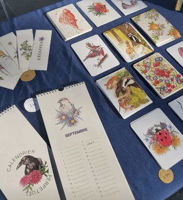 Je participe régulièrement à des marchés de créateurices et d'artistes. Cela me permet de diffuser les reproductions de mes oeuvres, et de m'amuser à créer des produits de papeteries comme des carnets ou des calendriers.