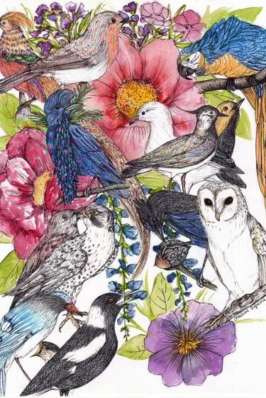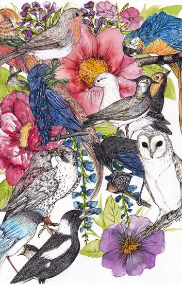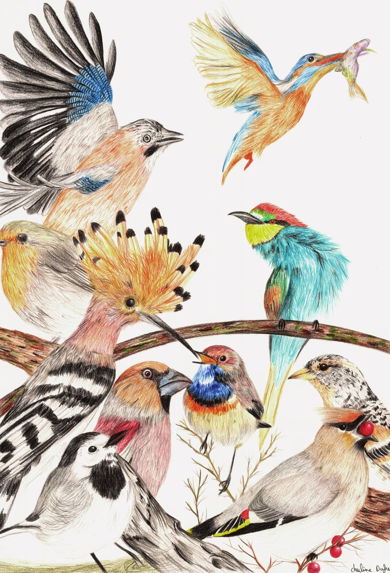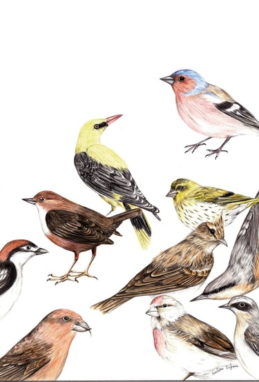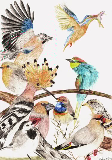 🌸 Je m'appelle Charline et je suis artiste. Avec mes crayons de couleurs, et parfois l’aquarelle, je réalise des illustrations réalistes inspirées de la nature. Etant ornithologue amatrice mes sujets de prédilections sont les oiseaux. Avec mon travail je cherche à montrer la beauté, la diversité et toutes les couleurs présentes dans la nature. J'aime jouer avec la composition et l'accumulation et créer des mises en scènes inattendues.